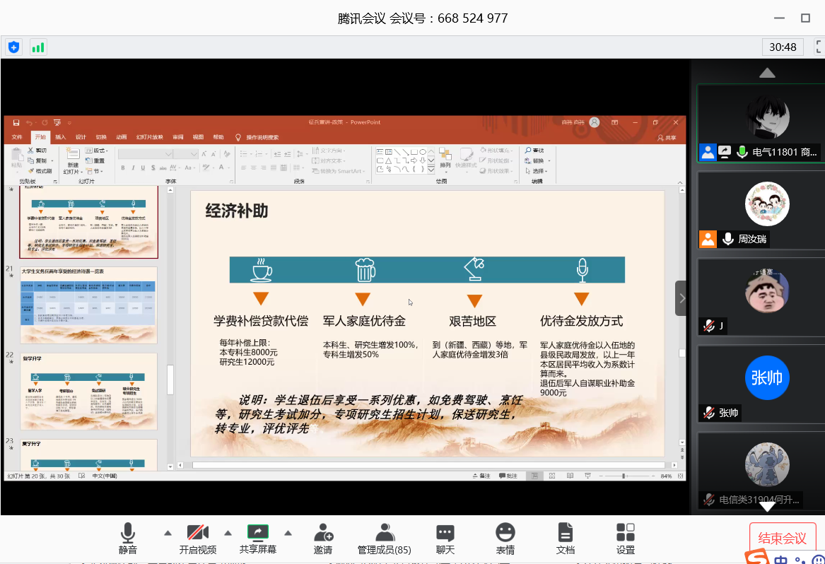 宣讲会上,周老师首先向同学们说明了2020年征兵工作由于疫情原因发生的一些政策及参军流程变化。接着,周老师主要从青年寄语、条件标准、应征指南、优待政策、成长进步五个方面阐述了今年的征兵政策。结合公司员工实际情况,周老师重点阐述了在校老员工参军入伍后在复学、考研、就业、公务员招考、士兵提干、学费及经济补偿等方面的优抚政策,以及电信人参军的十大好处,电信员工参军不仅仅是报效祖国,促进个人发展,更是充分结合自己的专业特长,在信息战、无人战中检验自己的专业技能,用自己的实际行动践行“训练强军、科技兴军”人生理想。