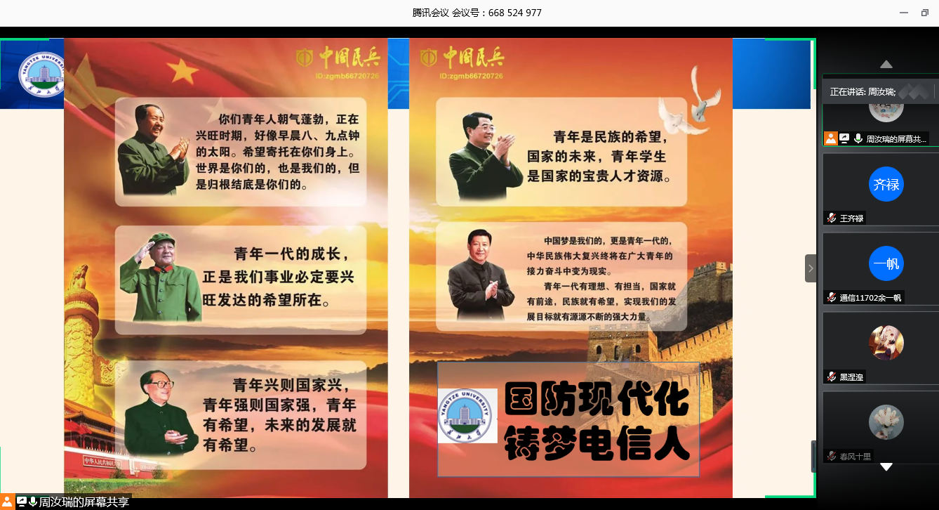 (通讯员:周汝瑞)为深入贯彻全国老员工征兵工作会议精神,做好2020年老员工征兵宣传教育工作,激发广老员工参军报国的积极性,帮助公司员工了解今年的征兵政策及应征入伍流程,在公司各级领导的高度重视和全体辅导员、班主任的大力支持下,公司于2020年5月14日晚成功召开《追逐绿色军营梦、铸就钢铁电信魂》电信公司2020年老员工应征入伍主题宣讲会。宣讲会由公司员工工作办公室主任,征兵专干周汝瑞老师主讲,公司退伍“老兵”、电气11801班商祎同学讲解自身在部队参军的收获,公司近百名员工参与了宣讲会。