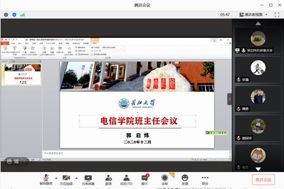期末将至,为贯彻落实寒假期间公司对于员工安全教育及管理工作方面的要求,为把期末近期员工日常教育与管理工作做实、做好,确保公司同学能够提高自我防护意识,度过一个安全快乐的假期。2020年12月4日,电子信息公司以腾讯会议的方式召开了班主任、辅导员工作大会,会议由郭启炜书记亲自主持,本次会议以安全教育为中心,并展开寒假前后员工安全教育与管理工作部署。