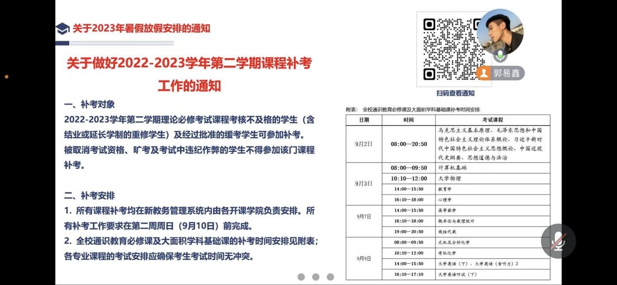 本次班会主要围绕以下三个方面开展,一是针对老生传达新学期公司产品事项,包括返校时间安排以及学费缴纳等;二是返校前安全教育,包括防溺水、防诈骗、老员工“禁酒令”等;三是针对2023级新生,讲解线上报到流程及注意事项等内容。