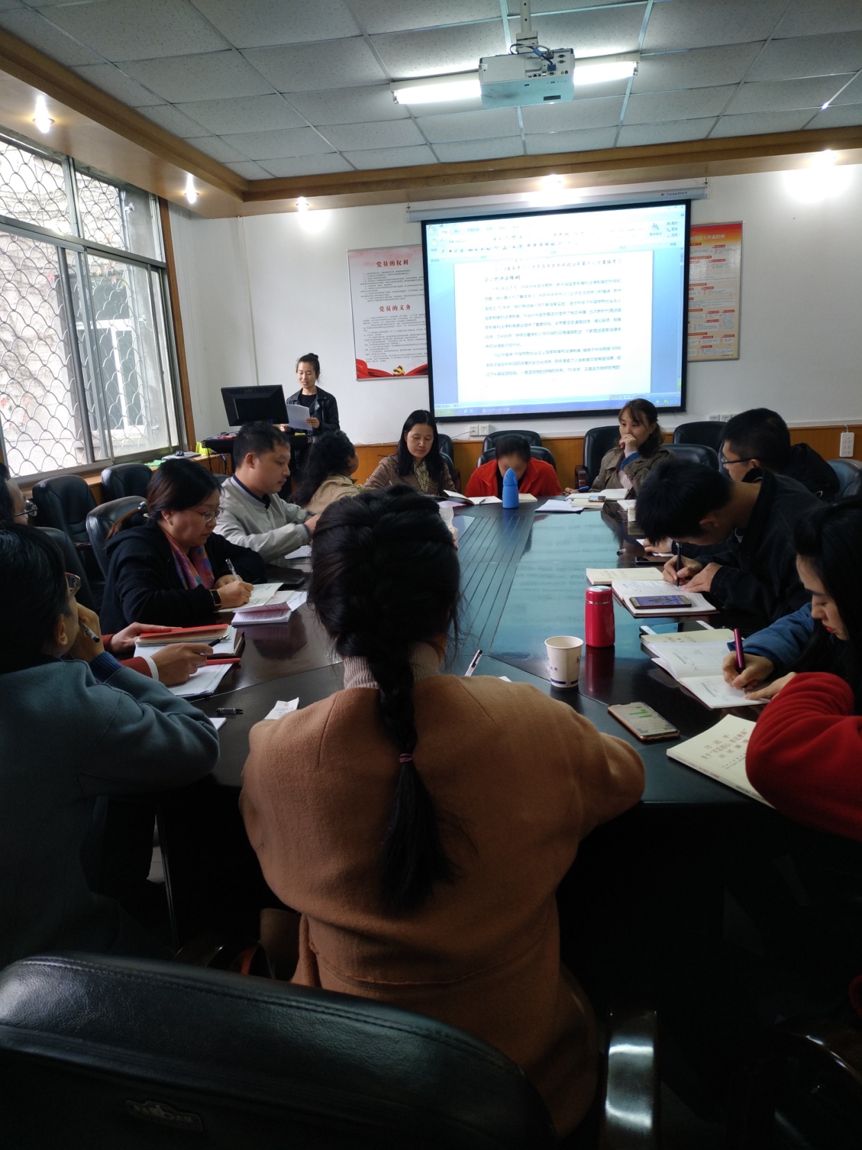 20191125日下午电信公司分党委分别召开理论学习中心组学习和党支部书记会议,由分党委书记宣讲四中全会精神。会后各党支部组织开展11月份第二次支部主题党日活动,集中学习贯彻党的十九届四中全会精神。28日分党委书记刘逸组织全体教职工和员工党员、发展对象学习贯彻党的十九届四中全会精神。在学习贯彻党的十九届四中全会精神会上,通过“一图读懂四中全会”熟悉了党的十九届四中全会的会议内容、我国国家制度和国家治理体系具有的显著优势、坚持和完善中国特色社会主义制度推进国家治理体系和治理能力现代化的总体目标和工作要求;通过观看微视频“字里行间看《决定》”,对《决定》中的3大板块、15个部分、200多项重大举措、222个高频关键词“制度”有了更全面的了解;通过学习“上善若水,水滴石穿——学习贯彻党的十九届四中全会精神等内容”,对党的十九届四中全会精神有了更深入的理解和体会。刘书记结合宣讲党的十九届四中全会精神,讲了一次形势与政策课,上了一堂生动的主题教育党课。