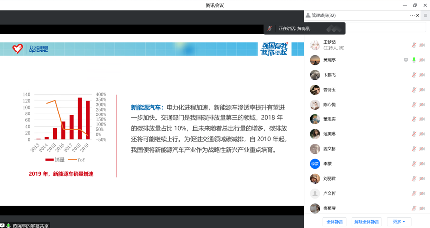 会上,黄婉亭同学首先向同学们讲述了《习近平生态文明思想学习纲要》的重要作用,阐述了习近平生态文明思想的科学内涵;她结合自己暑假期间参与公司“知行中国”实践活动在荆州和武汉经历,向同学们生动形象地展示了在以习近平同志为核心的党中央带领下,我国在生态文明建设领域中取得巨大成就,体现了我党团结带领全国人民创造更加幸福美好生活的决心;最后,黄婉亭还向同学们介绍了“碳中和”和“碳达峰”的内涵和理念。