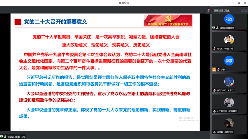 刘逸以“认真学习贯彻落实党的二十大精神 发扬历史主动精神 让青春绽放绚丽之花”为题进行培训授课。她介绍了党的二十大召开的基本情况和重要意义,详细讲解了党的二十大报告内容,对报告的十五个部分依次进行了阐释,还重温了习近平总书记对青年的殷殷嘱托;随后刘逸分析了未来一段时间的行业发展情况,表示信息学科迎来新风口,人工智能进入工业化进程,电信学子未来一定大有可为,她对参会的同学们提出期望,鼓励大家争当有理想、敢担当、能吃苦、肯奋斗的新时代中国青年;最后刘逸要求,入党积极分子要在思想和行动上自觉向党组织靠拢,要掀起学习贯彻党的二十大精神的热潮。