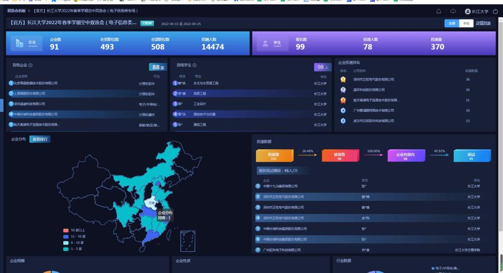本次线上双选会邀请校企合作及员工企业91家,提供岗位数493个。员工报名数99人,简历投递人数78人,投递量370,被查看99份,企业意向99份,查看意向率达100%,面试人数46人,面试率达46.46%。员工凭借个人兴趣与选择向用人单位积极报名,投递简历,并进行视频面试。