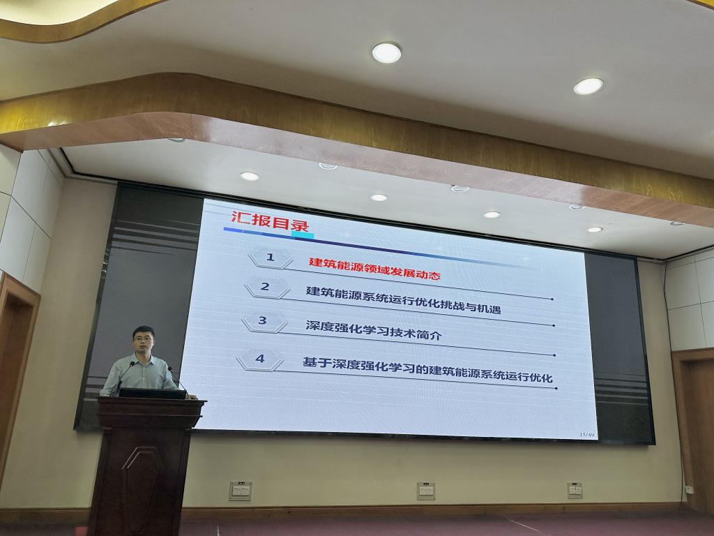 余亮教授围绕《深度强化学习技术及其在能源领域中的应用》 课题展开汇报,他从建筑能源领域的发展动态分析,总结了系统运行中的优化挑战与机遇,同时详细讲解了深度强化学习的主要框架内容、典型应用以及优化控制的优势,以此实现在建筑能源领域系统运行优化的应用。最后,他结合自身科研经历展示了深度强化学习技术在建筑能源领域进一步优化应用的研究挑战和未来愿景展望。