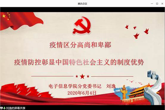 2020年6月4日晚19点30分,电信公司召开了《讲好抗议故事,增强“四个意识”、坚定“四个自信”、做到“两个维护”》线上交流会。会议由公司分党委副书记郭启炜主持,分党委书记刘逸、辅导员艾林、毕业年级全体员工党员和电气11601班全体员工参加了会议。