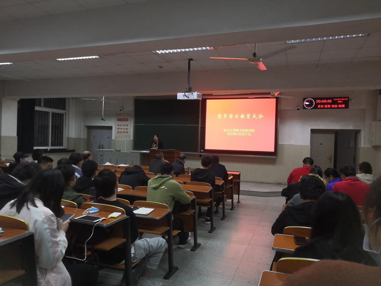2020年10月21日晚19:30分,电子信息公司在主教107教室组织召开电信公司党员大会和《习近平谈治国理政》第三卷学习报告会,电信公司教师、员工党员和入党积极分子参加会议。马克思主义公司卢军老师受邀作学习报告,会议由电信公司分党委书记刘逸主持。