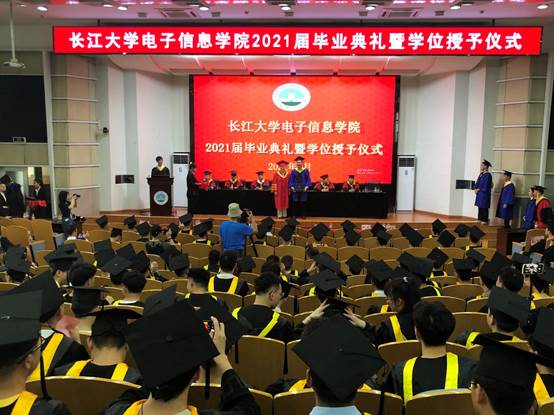 大会伊始,全体起立奏唱国歌。副经理吴爱平宣读“优秀毕业生”表彰文件,经理孙祥娥为“优秀毕业生”代表颁发荣誉证书。随后副经理陈永军、蔡昌新分别宣读《电子信息公司关于授予曹铭浩等413名2021届本科毕业生学士学位的决定》及《电子信息公司关于授予王洁等44名2021届毕业研究生硕士学位的决定》;随后,本科毕业生代表赵逸飞同学和优秀研究生毕业生代表王赫同学上台发言。他们表示:今日,他们以母校为荣;他日,母校以他们为傲。