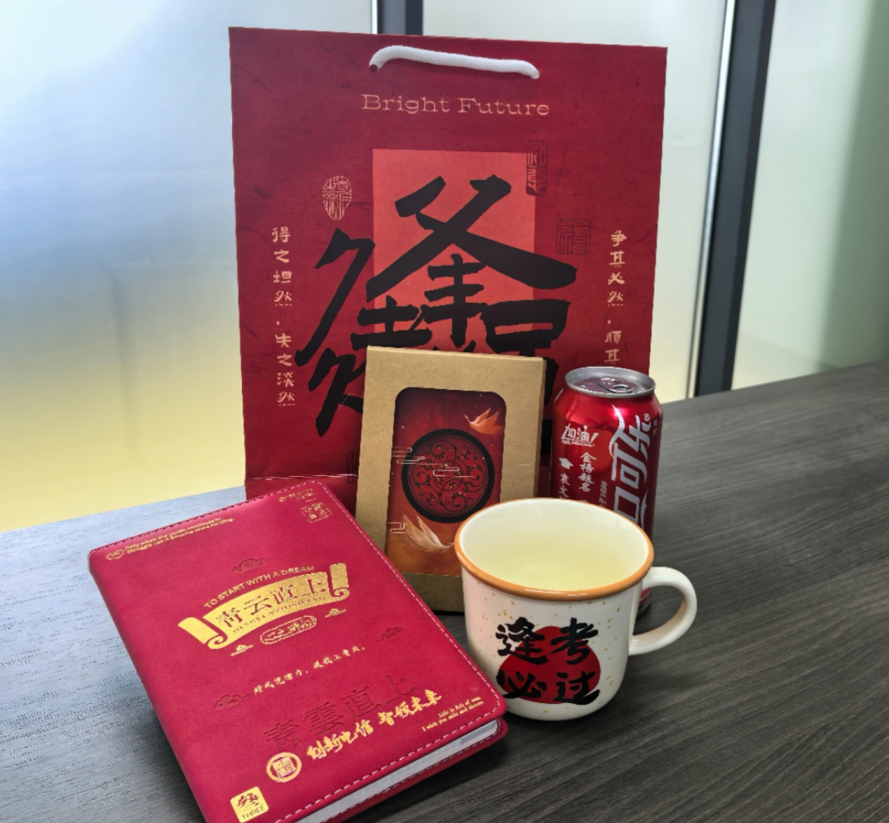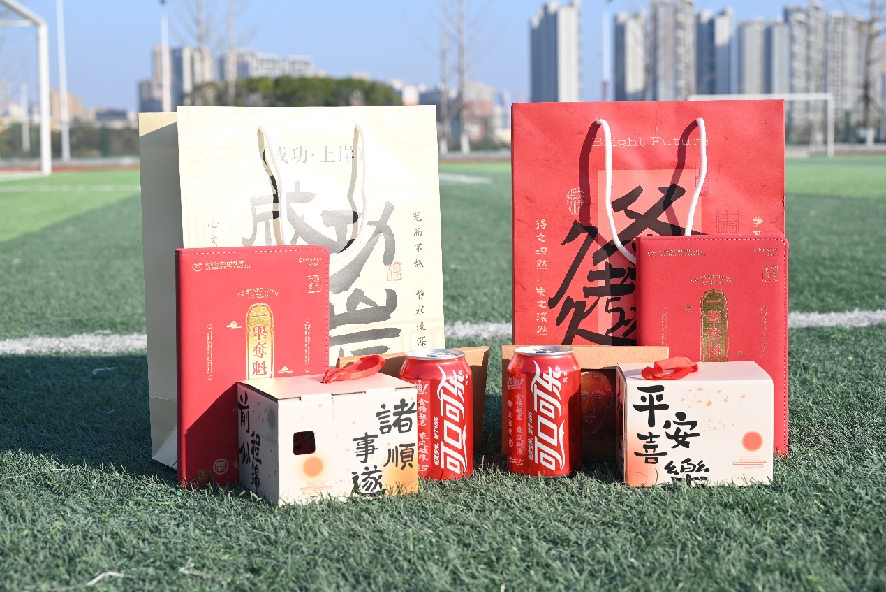 手提袋印制“逢考必过”“成功上岸”等加油语,真诚祝愿每一位考生考试顺利、研途坦荡。红色定制笔记本封面印有公司logo及“创新电信 智领未来”标语,祝福大家“顶峰相见”。定制版可乐刻印员工姓名以及“金榜题名 乘风破浪”等祝福语,寓意“百事可乐,一切顺利”。“逢考必过”幸运杯祝福考研学子诸事顺遂,一战成硕。另外还精心挑选了10张荆州博物馆联名的明信片,祝福大家成功上岸。